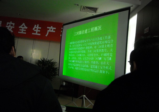 党组书记张永安同志首先就肥西县建设局发布的 “建设[2009]151号,建设[2009]154号,建设[2009]155号”文件中的工作进行安排。接着解军培同志讲述了“百日会战”开展情况,并就安全检查中存在的隐患以幻灯片的形式展示给参会企业,让企业领导体会在建项目安全隐患的严重性以及安全隐患处理的紧迫性。李绍敏同志就施工报建、安全生产、农民工工资等问题提出存在的问题及整改要求,重点对施工用电、临边防护、脚手架搭设及地面硬化、施工机具现场防护及现场施工人员的安全意识等方面存在的问题进行批评和教育,要求企业领导一定要在安全生产过程中起带头作用,深入项目施工现场,亲自把关,把整改措施落实到位。