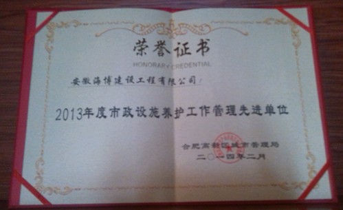 2014年4月,公司承揽的合肥市高新区市政养护工程,因表现优异,被合肥市高新区城市管理局授予“2013年度市政设施养护工作管理先进单位”荣誉证书。