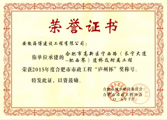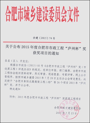 炎炎夏日,骄阳似火,我公司喜获2015年度合肥市市政工程“庐州杯”奖,给酷热的盛夏送来了阵阵凉意。由公司承建的合肥市高新区宁西路(长宁大道-肥西界)道桥及附属工程经合肥市城乡建设委员会及合肥市市政工程协会审定,顺利获得此次奖项。