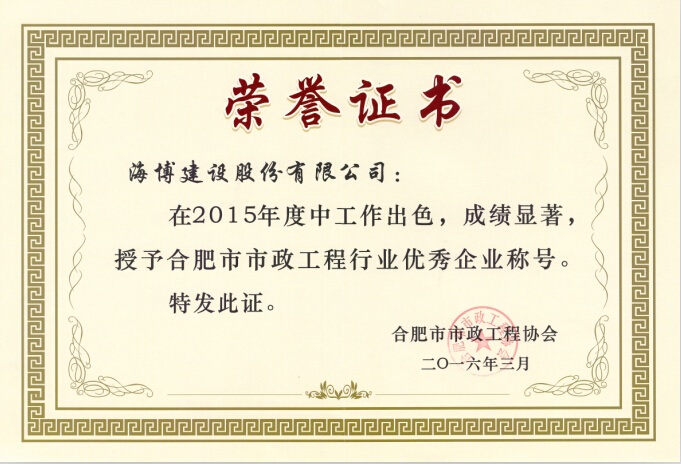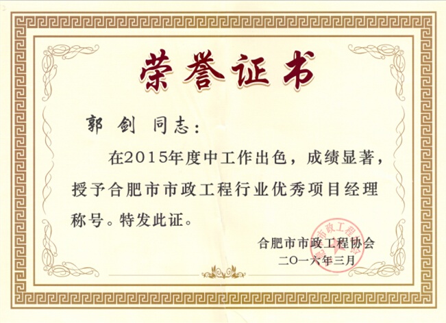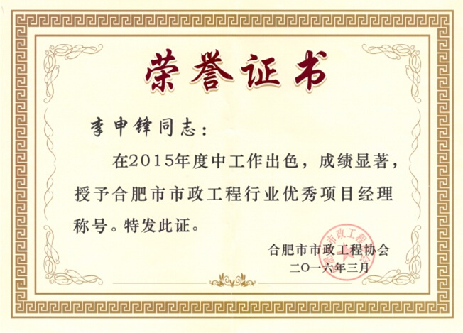 合肥市市政工程协会第三届三次理事大会于昨日召开,会上对2015年度评选出的合肥市市政工程“优秀企业”和“优秀项目经理”进行表彰,米兰站·官方端网站建设股份有限公司榜上有名,并且我司李申锋、郭剑两位同志也荣获“优秀项目经理”称号。