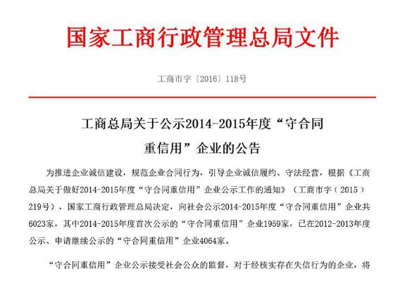 近日,国家工商行政管理总局向社会公布了2014-2015年国家级“守合同,重信用”企业名单,我公司以诚信经营的理念和实际行动再次获得社会各界的认可,荣获了此殊荣。