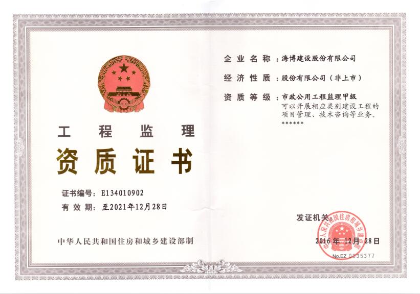 2016年12月28日,正值元旦佳节之际,我公司申报的“市政公用工程监理甲级资质”获批,至此,我公司已拥有市政公用工程施工总承包壹级、水利水电工程监理甲级、市政公用工程监理甲级三项国家级资质。
