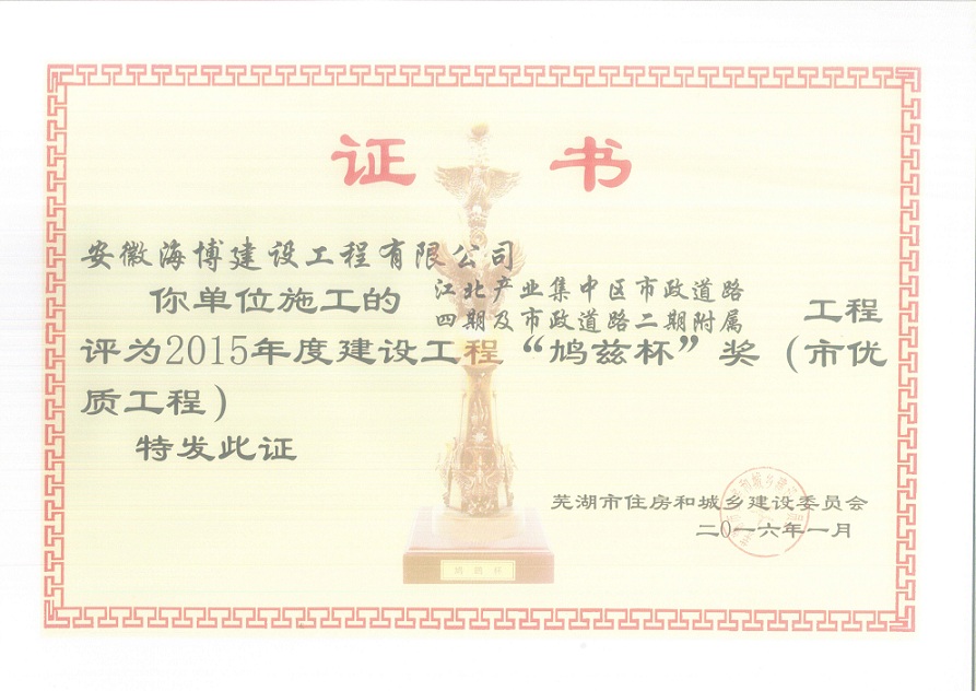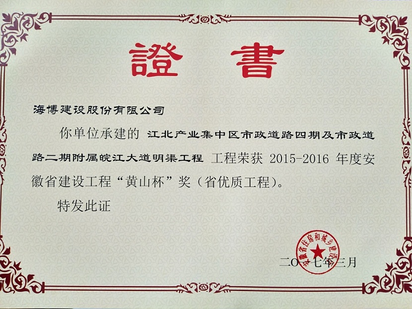 近期,我公司承建的江北产业集中区市政道路四期及市政道路二期附属皖江大道明渠工程,喜获2015-2016年度安徽省建设工程“黄山杯”荣誉。该工程位于芜湖市鸠江区江北产业集中区起步区内,路线全长约9.4km,呈“井”字形布局,路面宽度24~32m,设计车速40km/h,新建沥青混凝土路面,工程总造价约1.47亿元。2014年3月,荣获江北产业集中区“安全生产工作先进单位”称号。2016年1月,获得2015年度芜湖市建设工程“鸠兹杯”奖,全面实现了工程质量目标。
