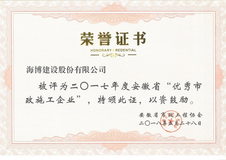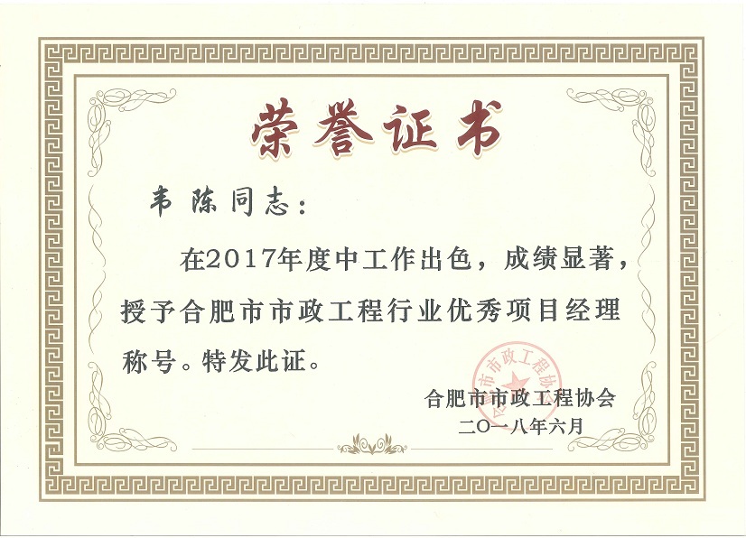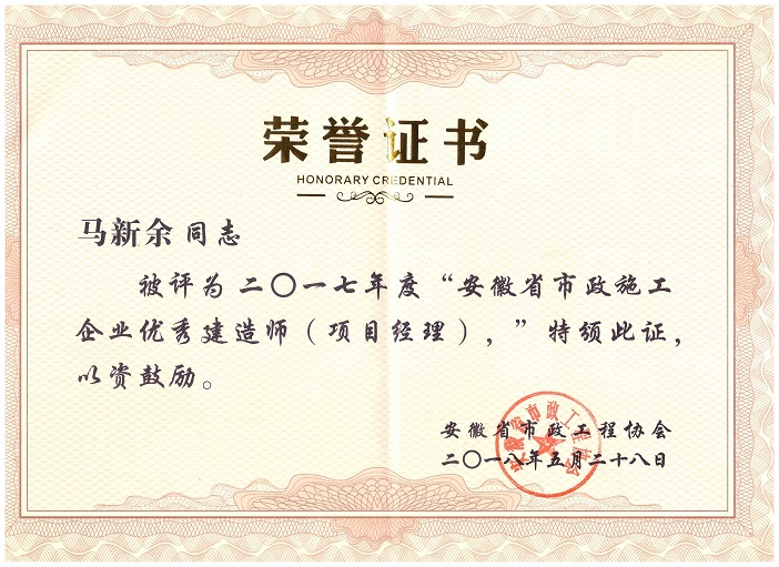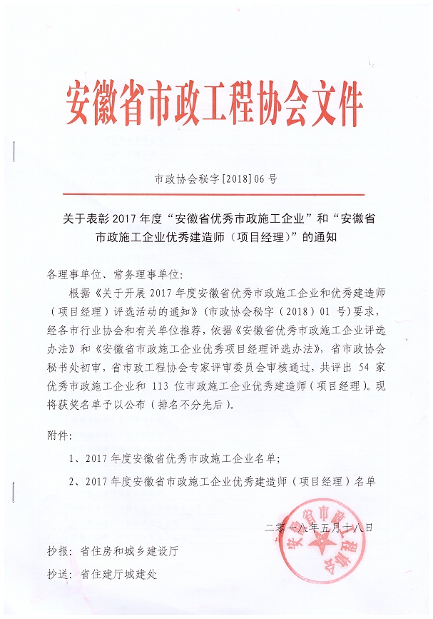 近日,安徽省市政工程协会发布了市政协会秘字【2018】06号文件,文件中表彰了2017年度“安徽省优秀市政施工企业”和“安徽省市政施工企业优秀建造师(项目经理)”。经过省市政工程协会专家评审委员会的层层评比,我司荣获2017年度“安徽省优秀市政施工企业”称号,公司马新余、周宗兵、赵行东三位同志被授予“安徽省市政施工企业优秀建造师(项目经理)”称号。