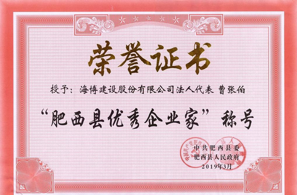 2019年3月30上午9:00整,肥西县创优营商环境推进高质量发展大会在县政府派河剧场隆重召开,并举行了“肥西县优秀企业”、“优秀企业家”颁奖典礼。集团公司董事长曹张伯先生获“肥西县优秀企业家”荣誉称号。