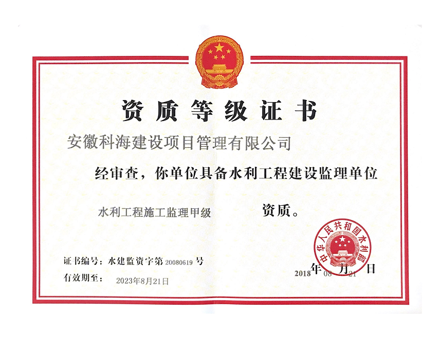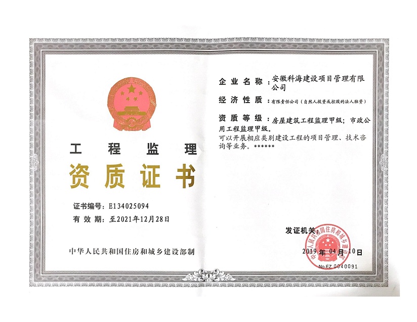 安徽科海建设项目管理有限公司现有国家级监理资质为:水利工程施工监理甲级、房屋建筑工程监理甲级、市政公用工程监理甲级。