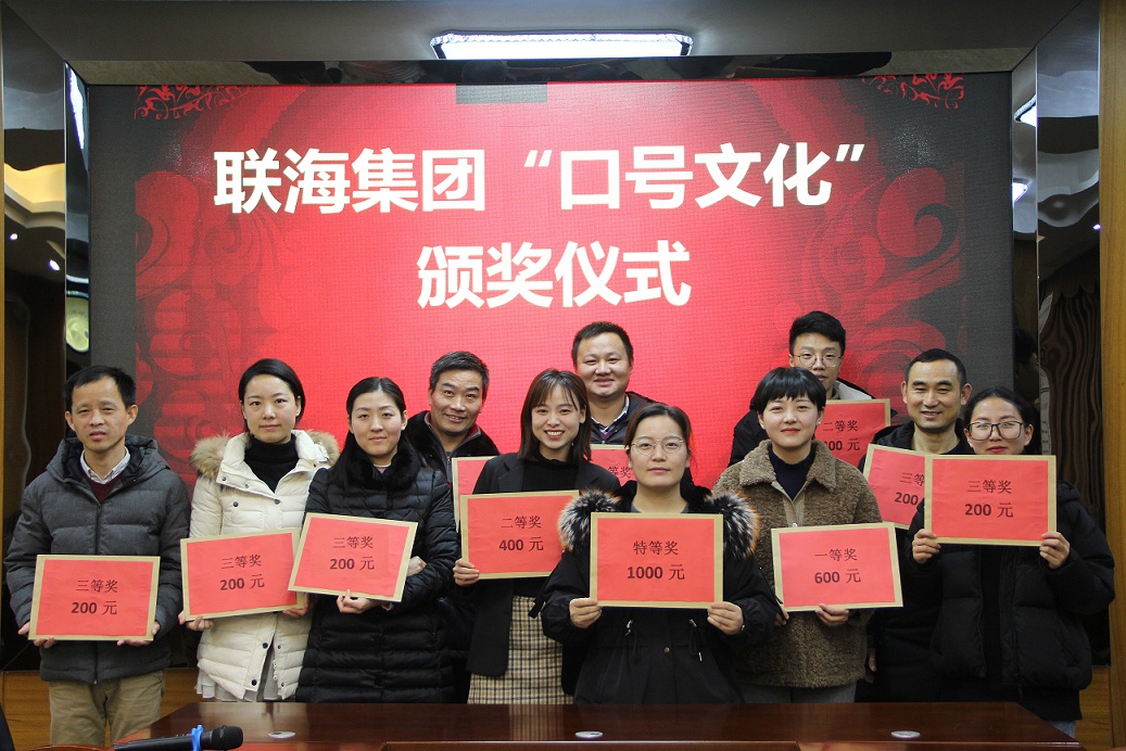 近期,集团公司开展了《关于联海集团“口号文化”征集大赛的通知》活动,经过两次征选、全员投票的方式,评比出特等奖、一等奖、二等奖、三等奖共计11条获奖口号。并于2019年12月25日下午17:00由发展战略执行中心组织了颁奖仪式,对获奖口号的部门给予表彰和现金奖励。