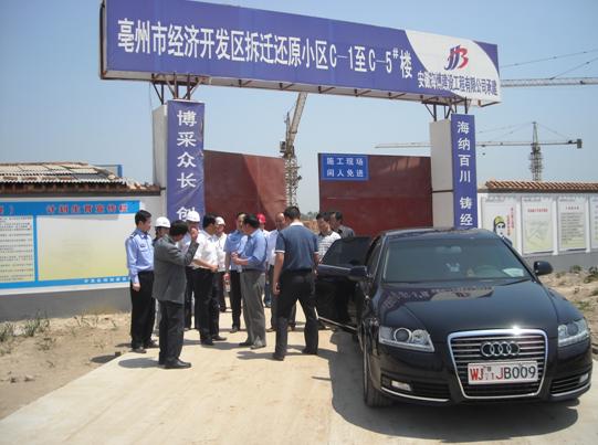 5月6日上午,亳州市副市长兼公安局长祁述志在市政府及经开区相关人员的陪同下,视察了我公司承建的亳州市经济技术开发区拆迁还原安置小区C1~C5#楼工程。祁市长实地查看了施工现场情况,分别听取了建设、监理及施工单位对该项目的详细介绍。祁市长对该工程的施工给予了充分肯定,并要求公司继续加强施工力量,鼓足干劲,加快施工进度,争取拆迁居民能早日搬进新家。