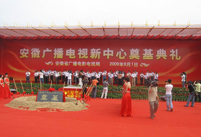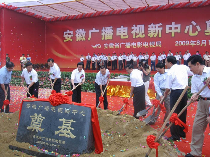 8月1日上午9:18分,合肥市政务文化新区美丽的天鹅湖畔,锣鼓喧天,彩旗招展,我公司承建的安徽“861”行动计划重大项目、省广播电视新中心项目奠基开工仪式在此隆重举行。