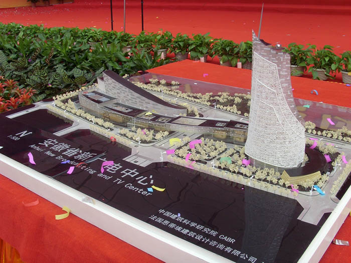 安徽省广播电视新中心项目位于笔架山街道辖区内的祁门路与怀宁路西南角,西邻蓝蝶苑,北临天鹅湖。主要由两栋楼构成,东边是49层的主楼,西边是演播大厅和一个露天演艺广场及一个高13层群楼, 东西两幢楼之间由一座景观桥连接,两楼造型均为S型.项目包括省电台、省电视台、省传输总台、省广电传媒产业集团和省网络公司等单位的节目制作、播出、传输以及监控机房等。新中心占地273亩,将分两期建设,一期建设26万平方米,投资17亿元;主楼高226.5米,建成后将成为合肥市最高建筑;广电新中心3600平方米的演播厅,为国内最大的电视演播厅,将于明年10月1号投入使用。